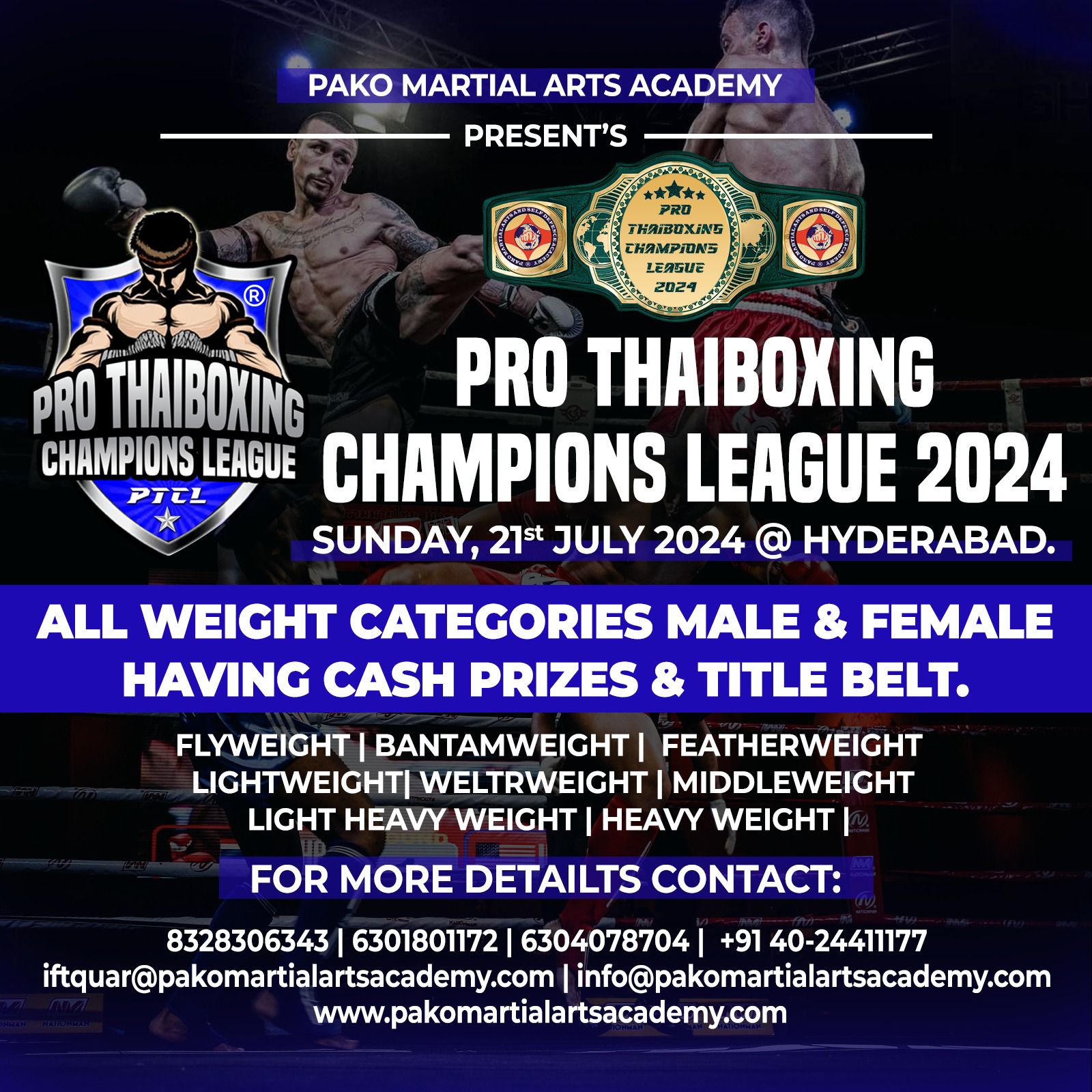 Pro Thaiboxing Champions League 2024 Sunday, 21st July 2024 @ Hyderabad All Weight Cateogories Males & Femals Having Cash Prizes & Title Belt