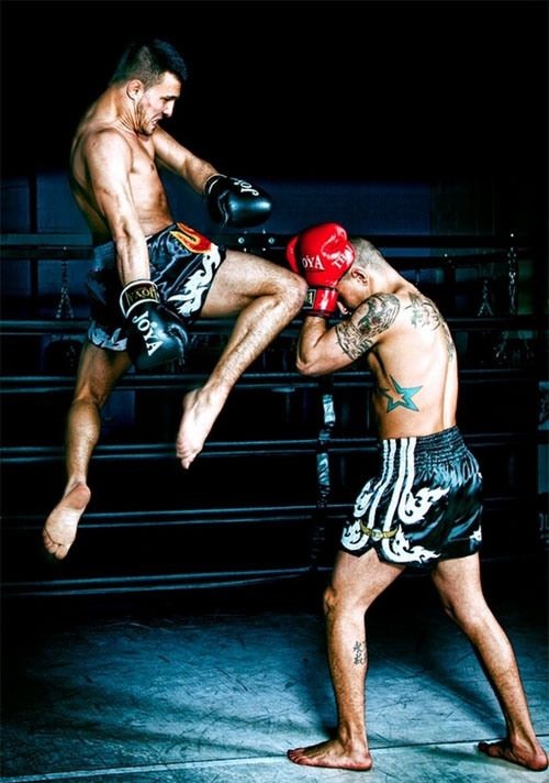 Muay Thai is referred to as “The Art of Eight Limbsâ€; and using eight points of contact the body mimics weapons of war. The hands become the sword and dagger; the shins and forearms were hardened in training to act as armor against blows, and the elbow to fell opponents like a heavy mace or hammer; the legs and knees became the axe and staff. The body operated as one unit. The knees and elbows constantly searching and testing for an opening while grappling and trying to spin an enemy to the ground for the kill.